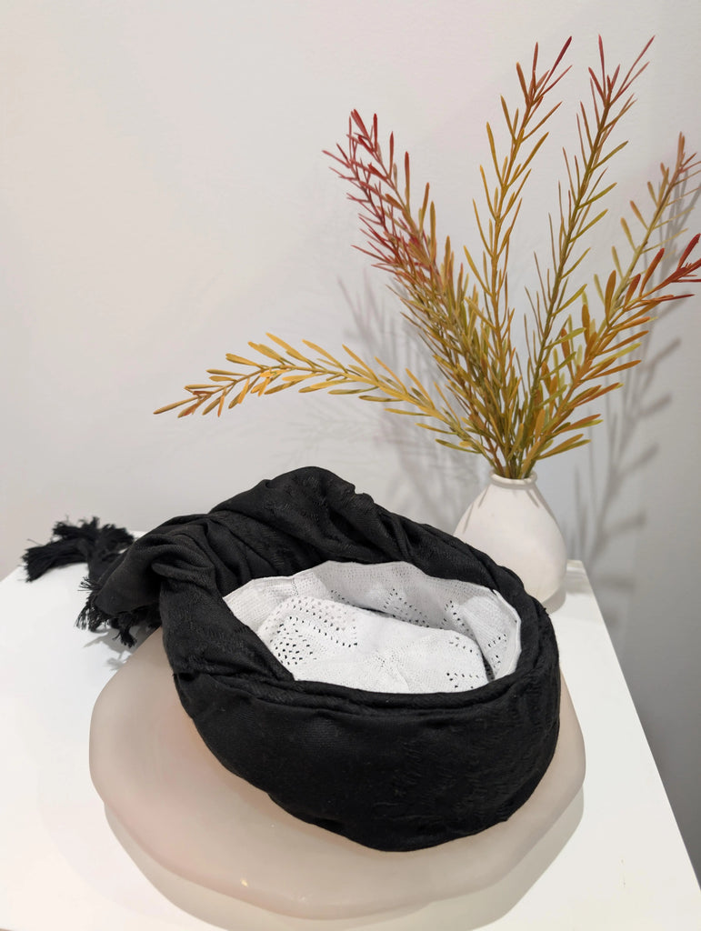 Black Arab Turban Cap Made In Dubai comprized of an all in one turban tied and stiched together on a flexi stretchy Made in Turkie Sunnah cap. Free Express Shipping Worldwide from Dubai, UAE.